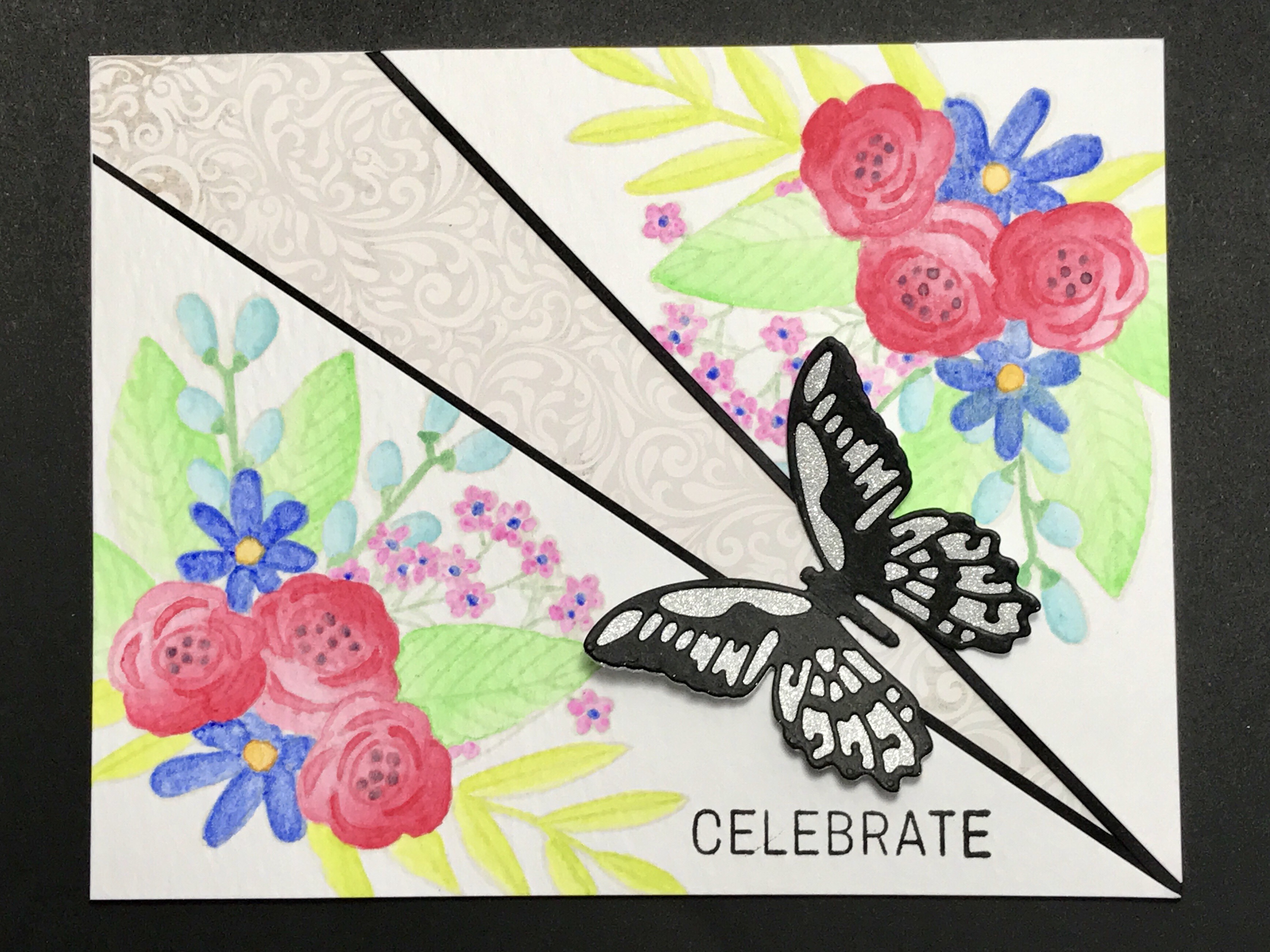 To turn this watercolor piece into a card, I used items that came in the Simon Says Stamps June 2017 Blissful kit: the “Celebrate” sentiment, one of the pattern papers, and the Black Color cardstock. I also added a butterfly that I cut using a Tim Holtz die cut. Below is the final card: