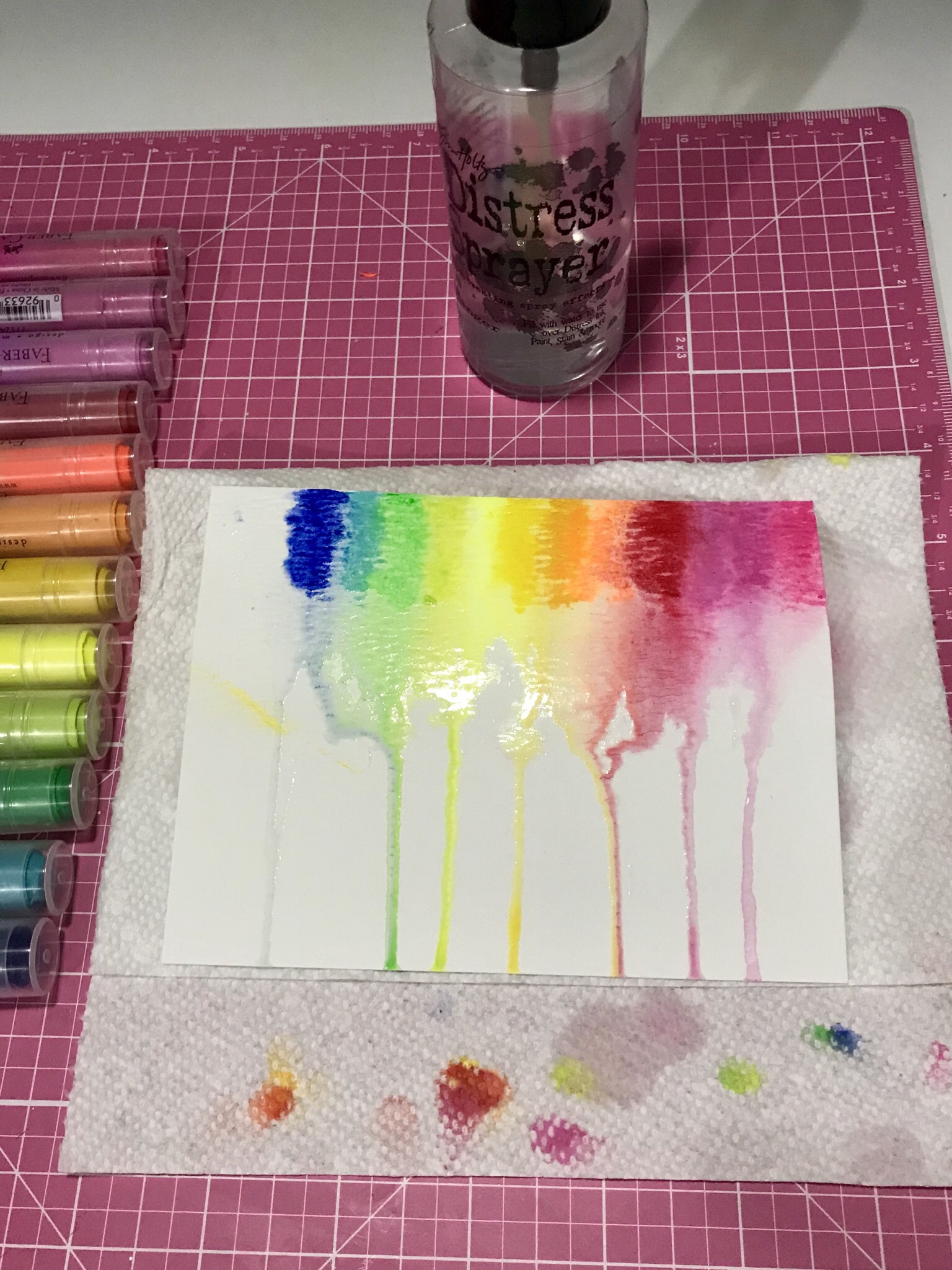 To test how reactive they are with water, I sprayed the watercolor piece above, tilted the piece upwards, and let the water run down the piece. See the cool and colorful results below: