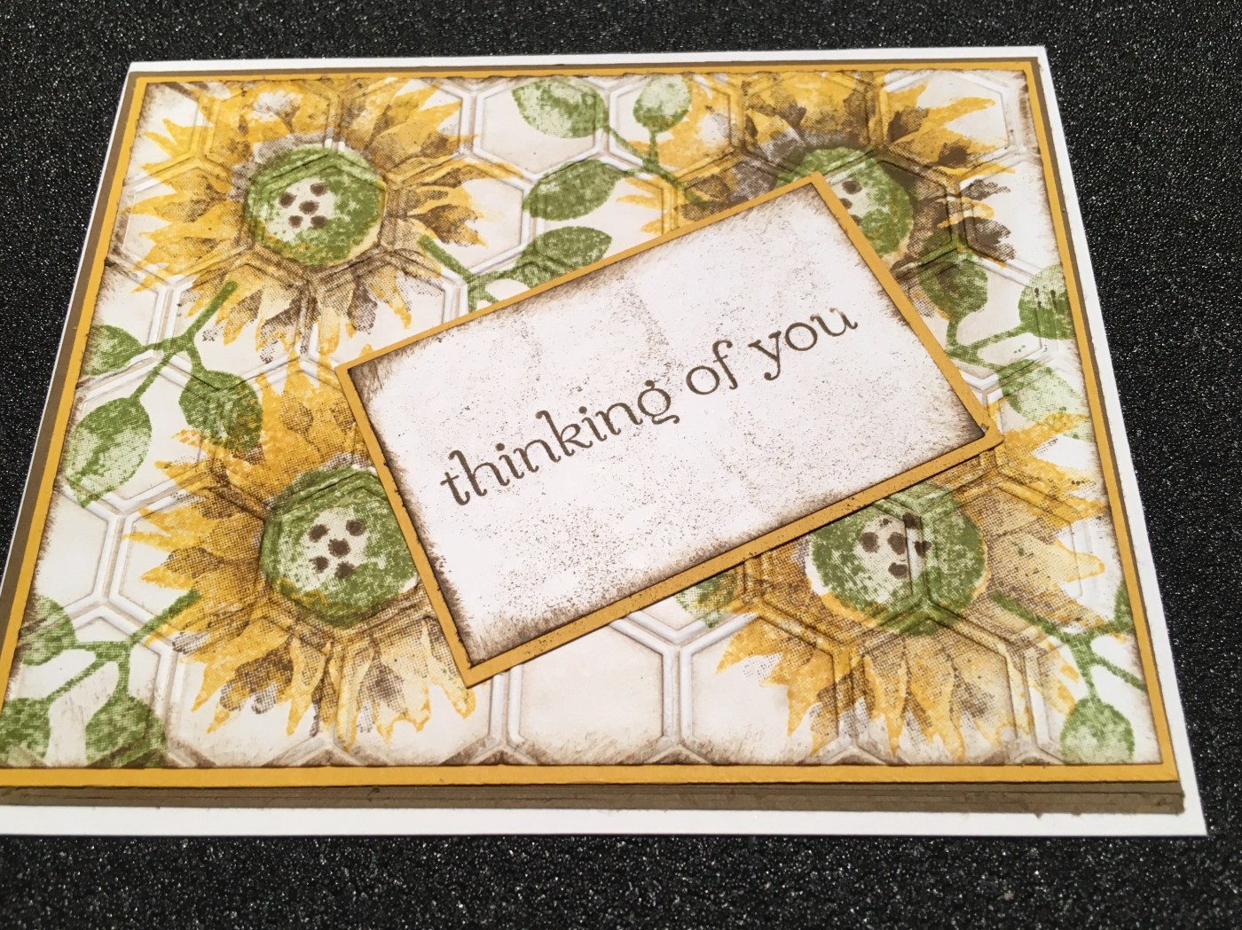 I was trying to get a “chicken wire” feel to the background, so I used my hexagon embossing folder to create this. I used a sponge rubbed in soft suede and very gently sponged the top “raised” part of my embossing folder. I then inserted my stamped cardstock and ran it through my big shot machine for the effect I was trying to achieve. Once that was complete, I went ahead and put together all my pieces to create the card base and layers I was looking for.