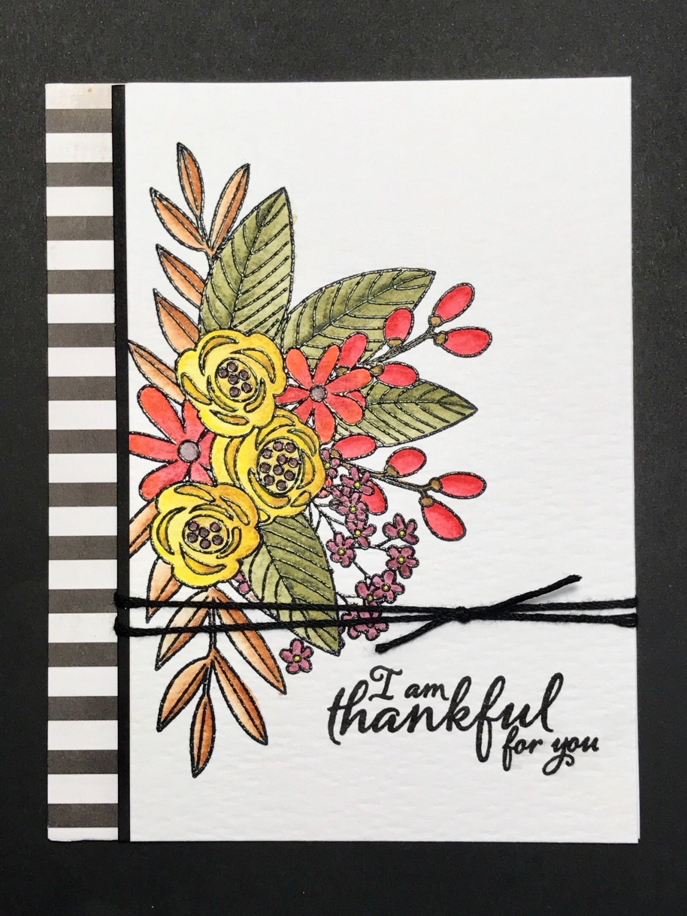To turn my watercolor piece into a card, I cut down the focal image to be 5.5” by 3.25”. I used items that came in the Simons Says Stamps June 2017 Blissful kit: the stripes pattern paper and the black color cardstock. In addition, I stamped the sentiment from the Painted Harvest Stampin Up set in VersaFine Black ink and added some black twine. See the final card below: