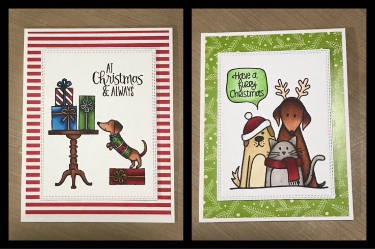 3. For the last set of cards, I made each a Christmas card. One card was made using the Ready for Christmas StampinUp Stamp set and the the second card with the Furry Christmas Simons Says Stamp set. I colored the images with Copic markers and added pattern paper for the background.