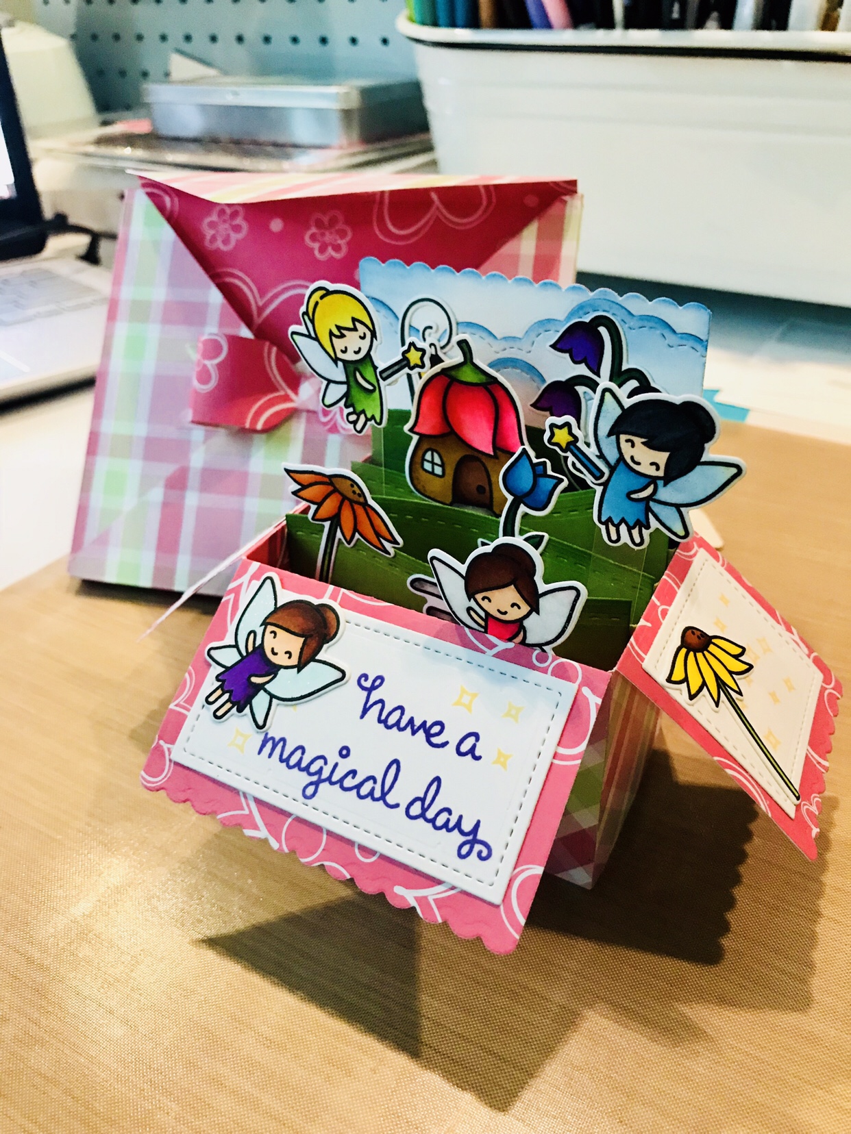 The second card was for my niece’s birthday whose turning 9 (time flies!). She just found out she’s going to be a big sister and really loves to craft! I wanted her birthday card to be girly and fun, so I decided to use the Lawn Fawn Fairy Friends stamps and dies. I stamped multiple of the images from the stamp set and colored them using Copic markers. To build the box I used double sided paper from my stash. To make the background I used the Lawn Fawn Puffy Clouds Border Dies to cut the clouds and Distress Ink to color them using a sponge dauber. Note: To make the fairies look like they were flying, I adhered them to the box using clear acetate!
