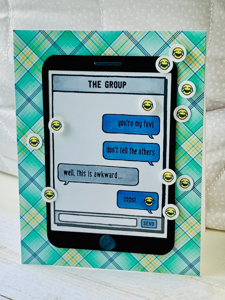 I stamped the text message images onto white cardstock and colored the text message bubbles using Copic markers. I also stamped the laughing smiley face multiple times, colored them with Copic markers, and cut them out with a circle puncher.