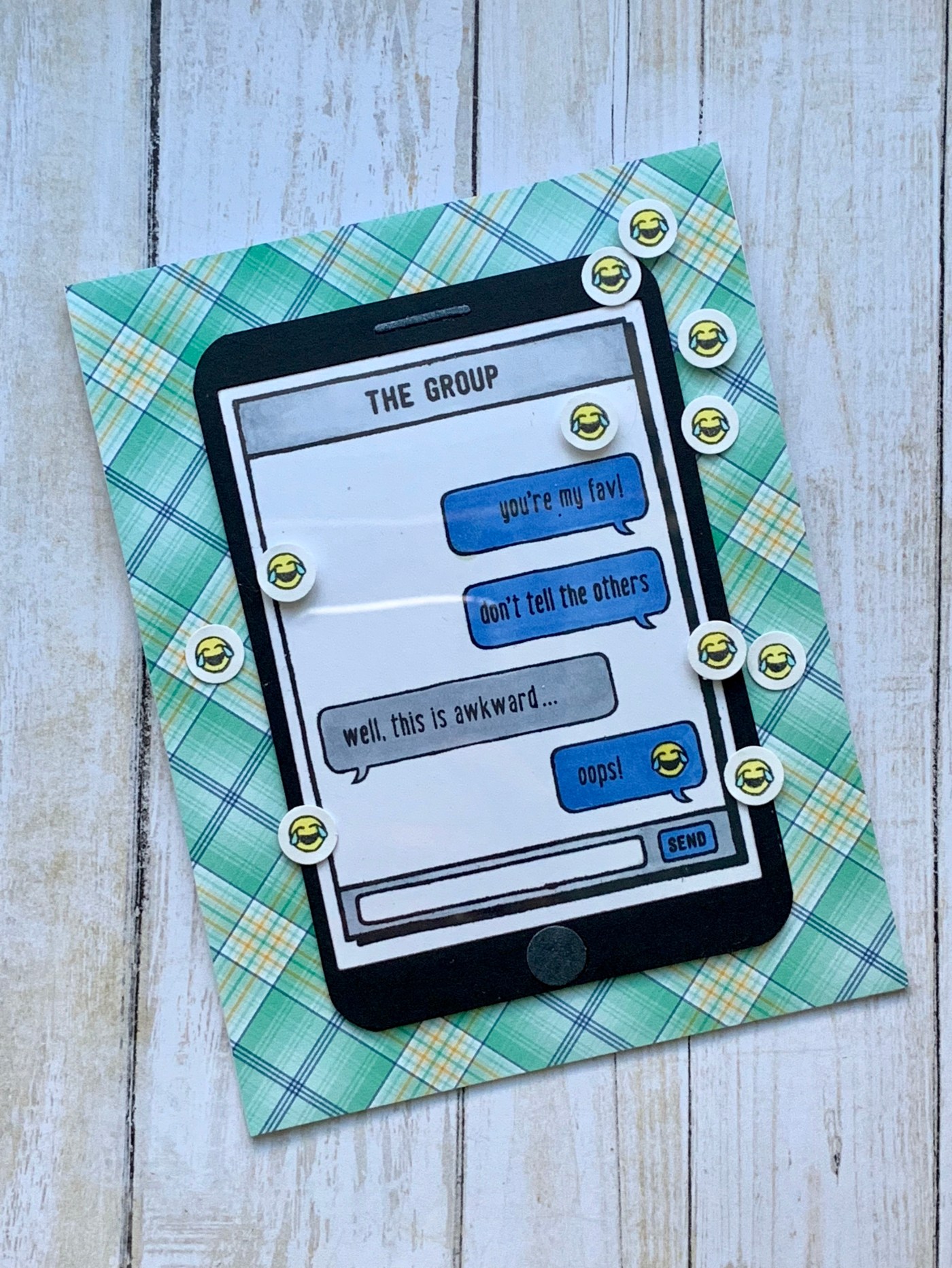 I got the card design idea from my own iPhone! There’s a feature when you text where you can send a message with a screen effect and have your message appear all over the screen for a second. So I thought it would be fun to have the laughing emoji on this card be all around the screen for fun!