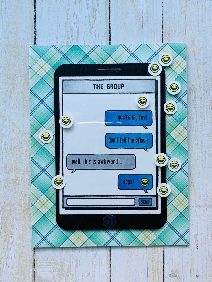 I stamped the text message images onto white cardstock and colored the text message bubbles using Copic markers. I also stamped the laughing smiley face multiple times, colored them with Copic markers, and cut them out with a circle puncher.