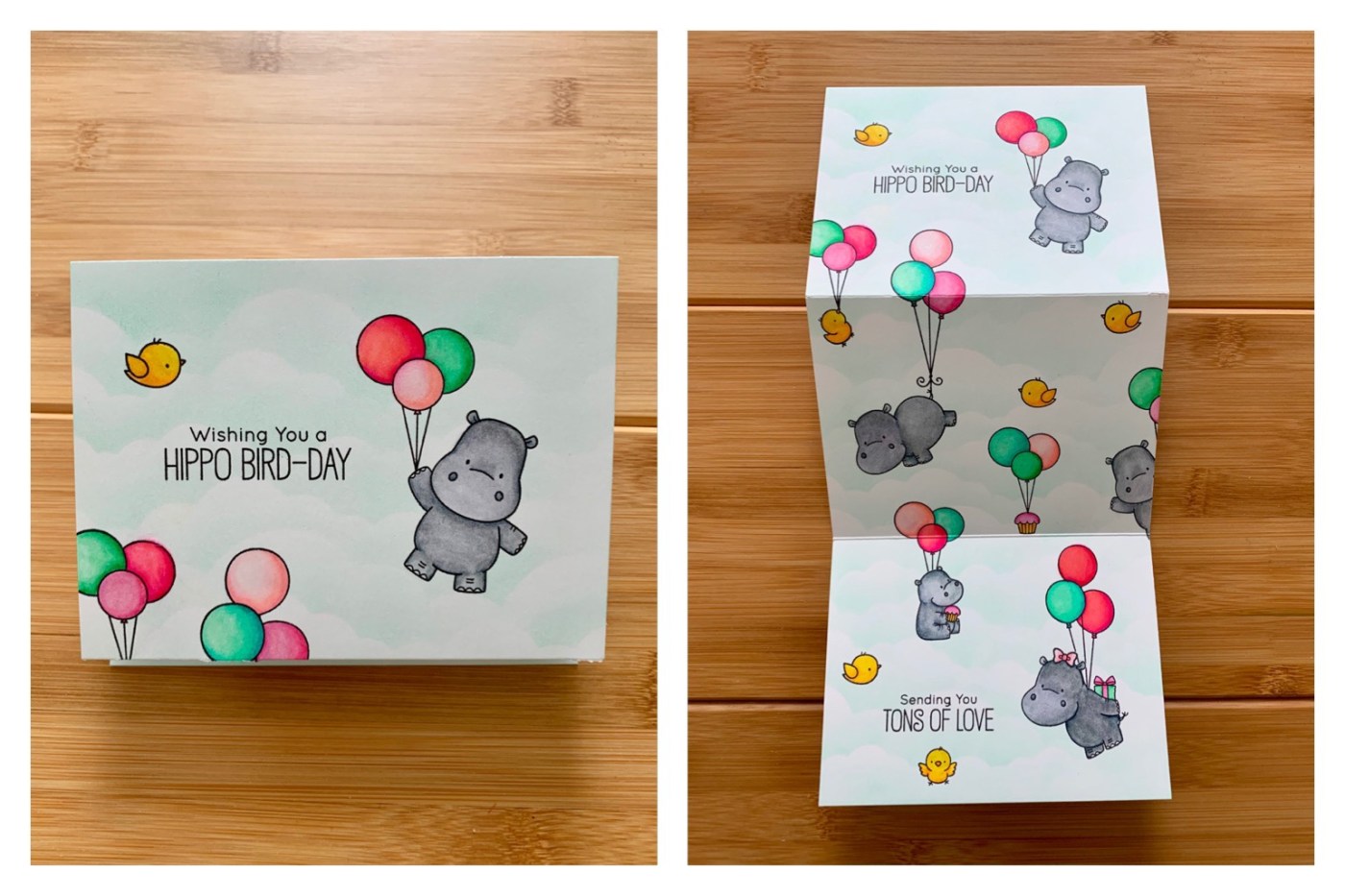 Next, I stamped the images from the My Favorite Things Happy Hippos stamp set using Black Onyx VersaFine ink (water safe). I also used a few images from My Favorite Things Beary Special Birthday and Up in the air. I watercolor the images using my Zig Clean Color marker. My color palette for this card was green and pinks with yellow as an accent!