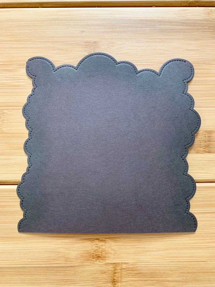 To make this card, I first created the background. I loved the clouds background that Nichol did on her video, and I wanted to create something similar. Now, I do not have the cloud stencil that she used so I created my own stencil using thick cardstock and Lawn Fawn’s Puffy Cloud Border dies. Using the cloud stencil I created, I sponged the background using cracked pistachio distress ink onto a 5.25″ x 12″ piece of white Bristol cardstock.