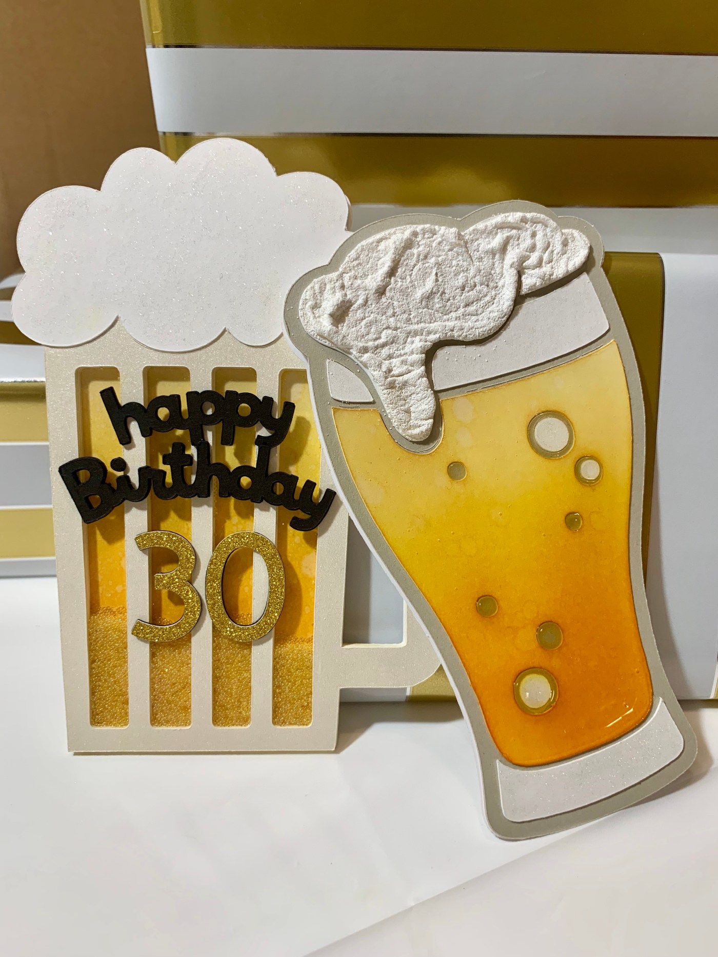 Lastly, of course I made him two cards in the shape of beers using my Cricut machine. The card on the left is a shaker card. The card on the right I did the foam using a lot of glue and thick white embossing powder. I covered the entire front of the card with glossy accents to make it look like glass!